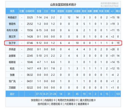 全场比赛,2米26的张子宇,一共打了7分46秒,第一节比赛,打了4分06秒,投篮5中5,砍下了10分4篮板。第二节比赛、第三节比赛,张子宇都是没有打。到了末节比赛,张子宇再一次登场,打了3分钟40秒,投篮7中4,交出了9分6篮板,就这样,张子宇轻松交出了19分10篮板1盖帽的两双数据。(10个篮板球当中,其中,有6个是进攻篮板球。)