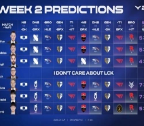 体育资讯1月21日报道宣称 LCK官方发布了本周的赛事预测:今天全员预测DK获胜 / T1对战KT全都看好T1。