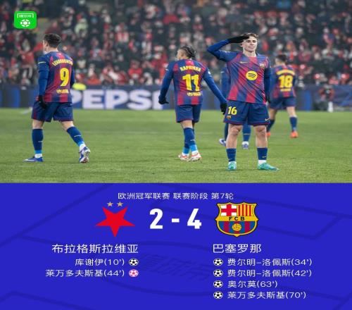 欧冠联赛阶段第7轮的一场比赛展开争夺,巴萨做客挑战布拉格斯拉维亚。上半场,库谢伊进球首开纪录,费尔明连进两球帮助巴萨反超,莱万多夫斯基乌龙球。下半场,德容进球被吹掉,奥尔莫